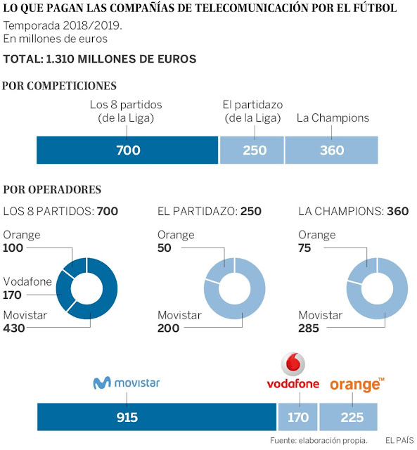 Deducimos con estos datos, que a Movistar la factura del fútbol le ha salido bastante cara, motivo por el que ha tenido que renunciar a diversos patrocinios entre otras acciones. Los 915 millones de euros que le costará la temporada, sólo salvarán sus cuentas si conseguir un alto porcentaje de captación de clientes que de paso aumente el coste por emitir publicidad durante los partidos.